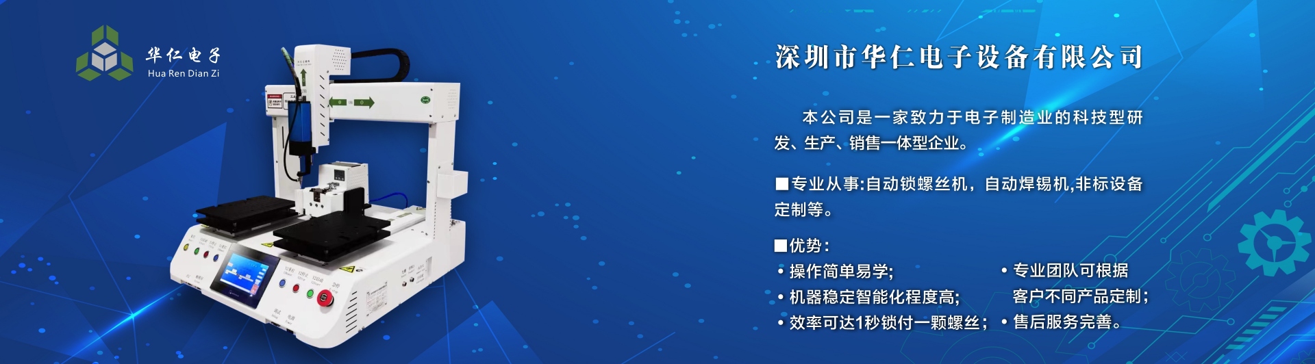 深圳市華仁電子設(shè)備有限公司是一家致力于電子制造業(yè)周邊設(shè)備的科技型研發(fā)、生產(chǎn)、銷售一體的企業(yè),專業(yè)從事:自動(dòng)鎖螺絲機(jī);自動(dòng)焊錫機(jī);非標(biāo)設(shè)備定制機(jī)等,公司長(zhǎng)期以來在行業(yè)中積累了豐富的經(jīng)驗(yàn),擁有專業(yè)的研發(fā)、技術(shù)、銷售支持工程團(tuán)隊(duì)、各高級(jí)技術(shù)人才為客戶提供優(yōu)質(zhì)產(chǎn)品和服務(wù),同時(shí)不斷吸取國(guó)內(nèi)外先進(jìn)技術(shù),更準(zhǔn)確及時(shí)地為客戶提供優(yōu)質(zhì),性價(jià)比高的產(chǎn)品、公司以專業(yè)的售前、售中、售后服務(wù)贏得了客戶的信賴和好評(píng),為客戶提供先進(jìn)自動(dòng)化設(shè)備一體式解決方案、